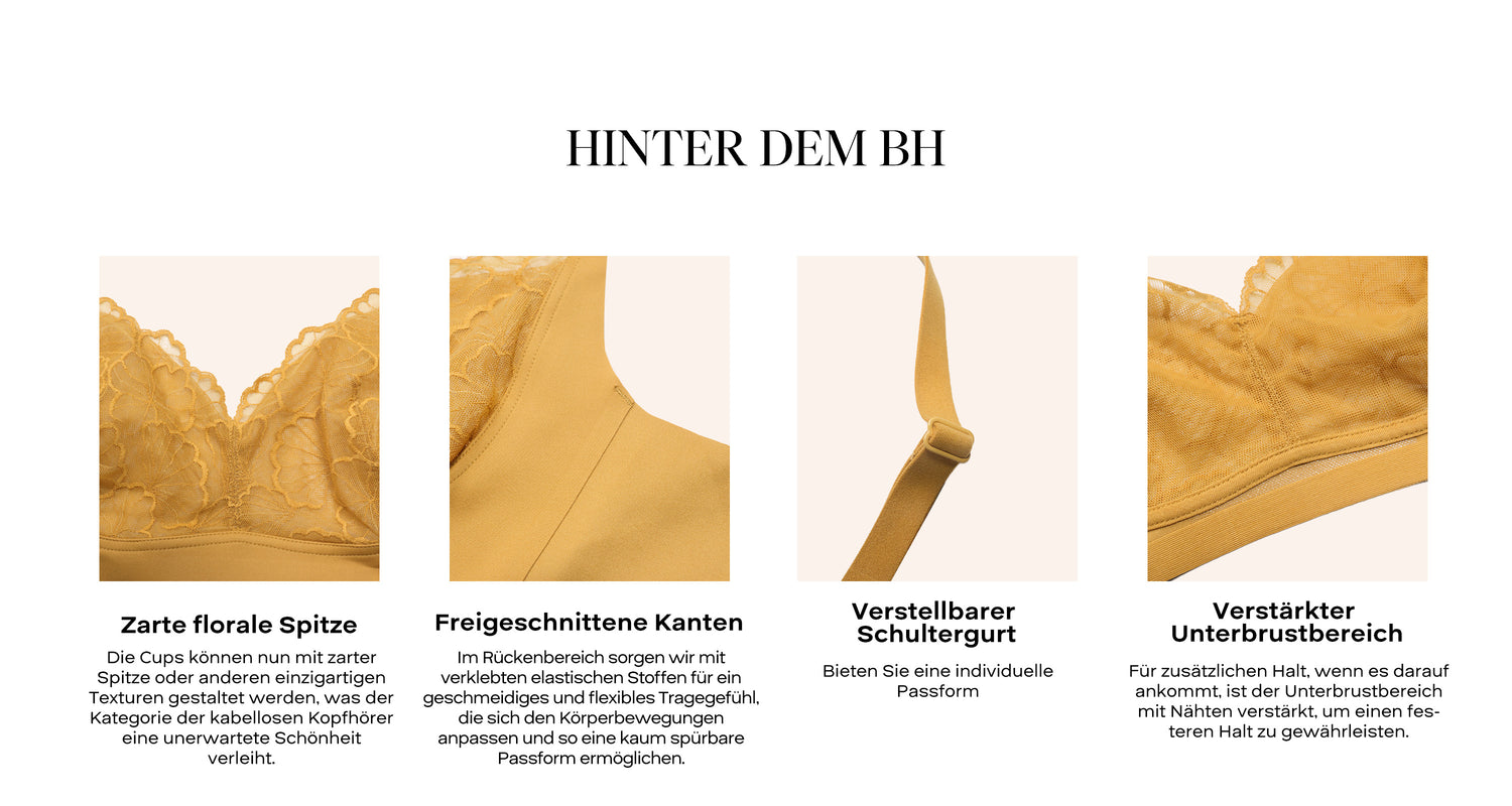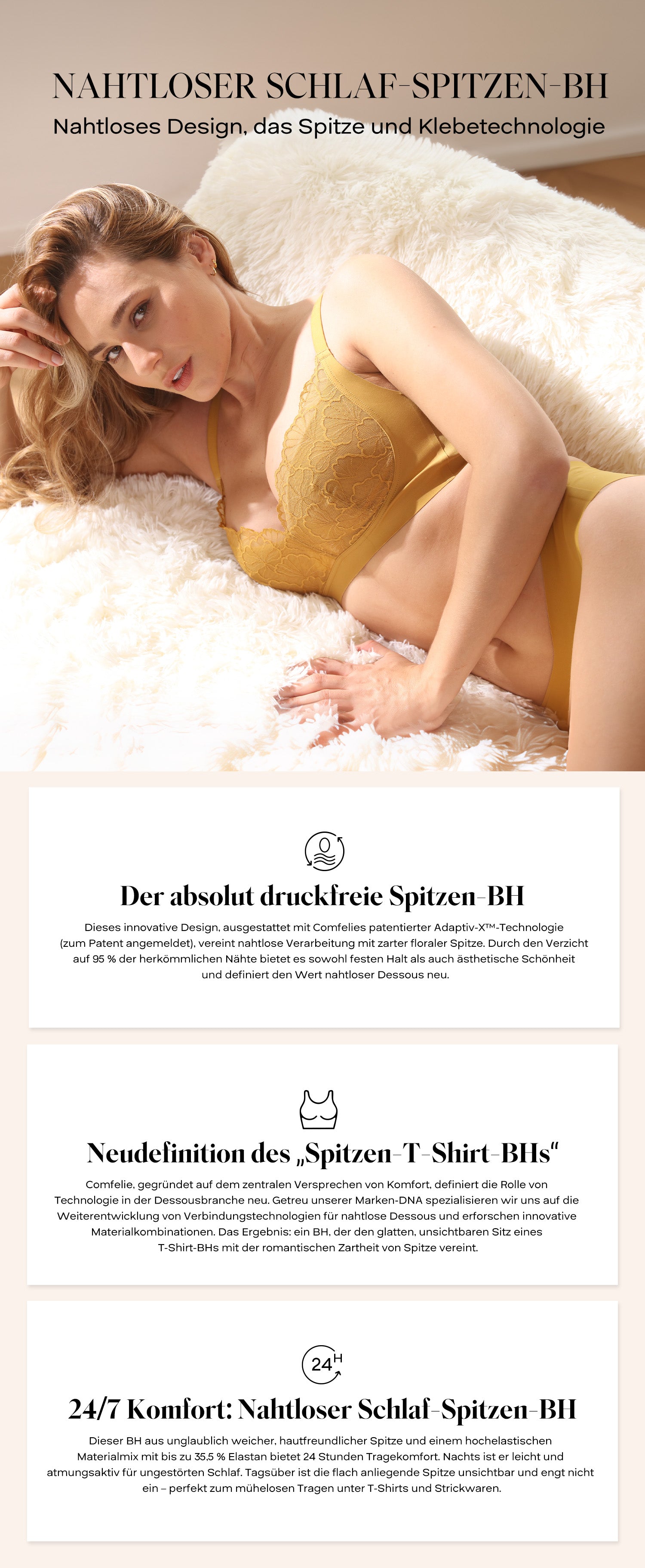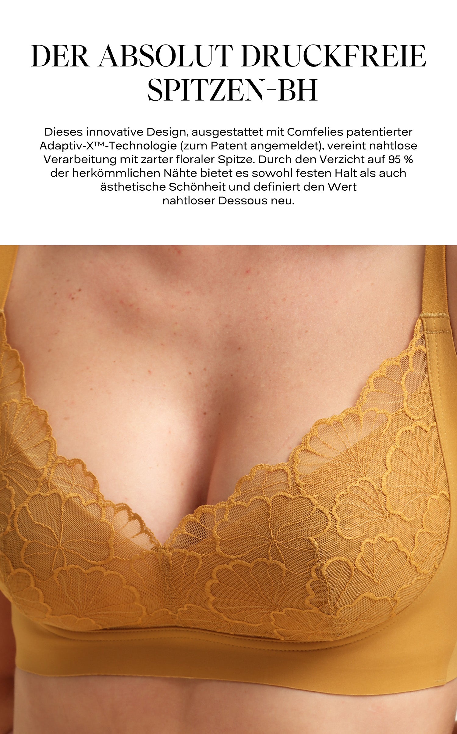 Ausgestattet mit Comfelies patentierter Adaptiv-X™-Technologie (zum Patent angemeldet), vereint dieses innovative Design nahtlos nahtlose Verarbeitung mit zarter floraler Spitze. Gefertigt aus unglaublich weicher, hautfreundlicher Spitze und einem hochelastischen Materialmix mit bis zu 35,5 % Elastan, bietet dieser BH 24 Stunden lang anhaltenden Tragekomfort.